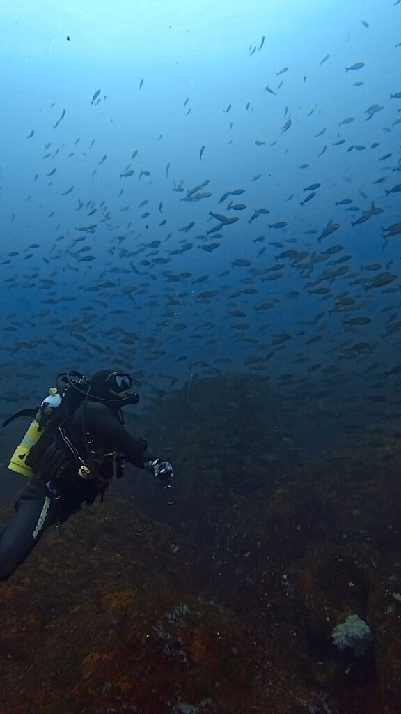 潮が効いているので中層勝負に。 深いところには体のサイズが横綱級のハンマーがいたり、上には小さめがいたりと楽しめた3DVでした。