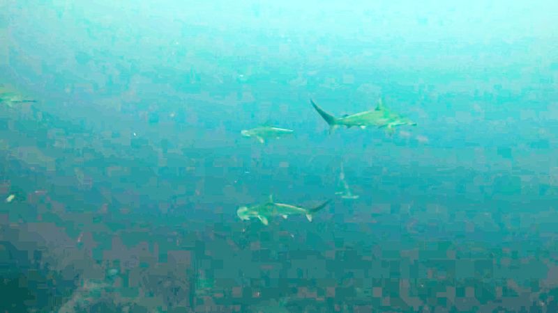 The school of hammers appeared and we could see them, but they were blocked by the turbidity and escaped immediately.