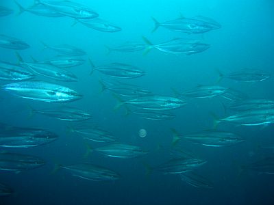 絶壁中間ではメジロの大群が水面を泳ぎ、南端に着くとハンマー大群(30匹)