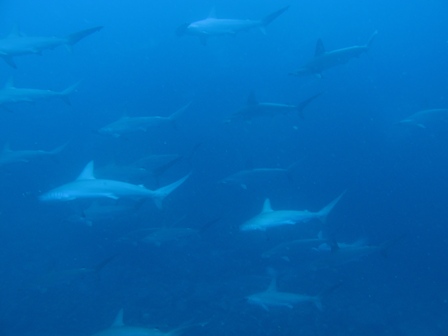 青い海に映える無数のハンマーヘッドシャークの群れ!