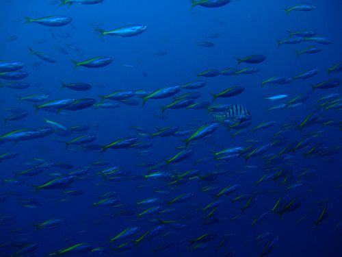 気を取り直しドロップオフ沿いに進むとタカベがごっちゃりで、ところ狭しと小魚が乱舞してます♪