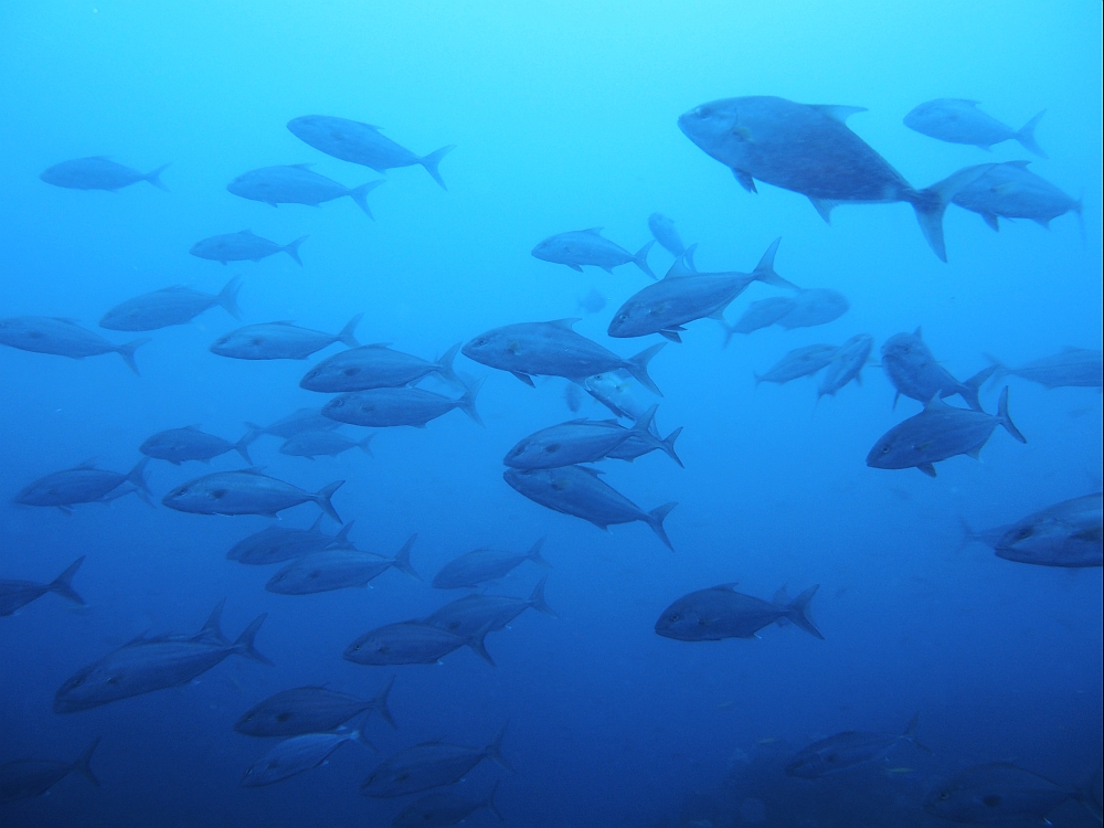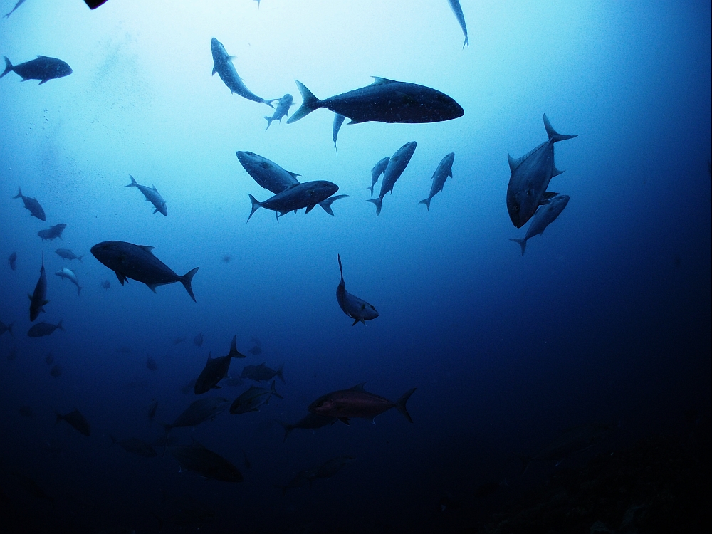 水温は21℃。透明度も決して悪くなく、潮に乗ってしばらくドリフトすると、やってきましたカンパチ集団!