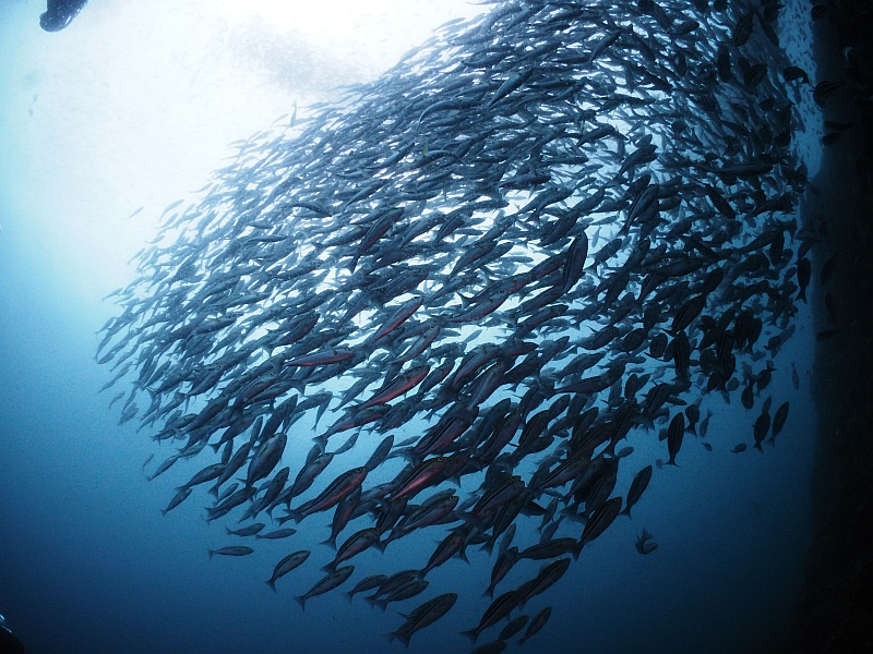 行く手を遮り、足元に広がり、迫りくるイサキの大群。