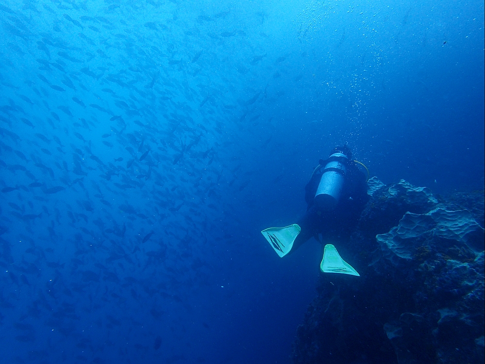 薄曇りのもと、蒼い潮を求めて船は沖へと向かいます。