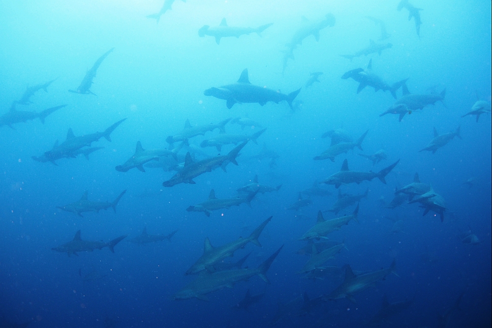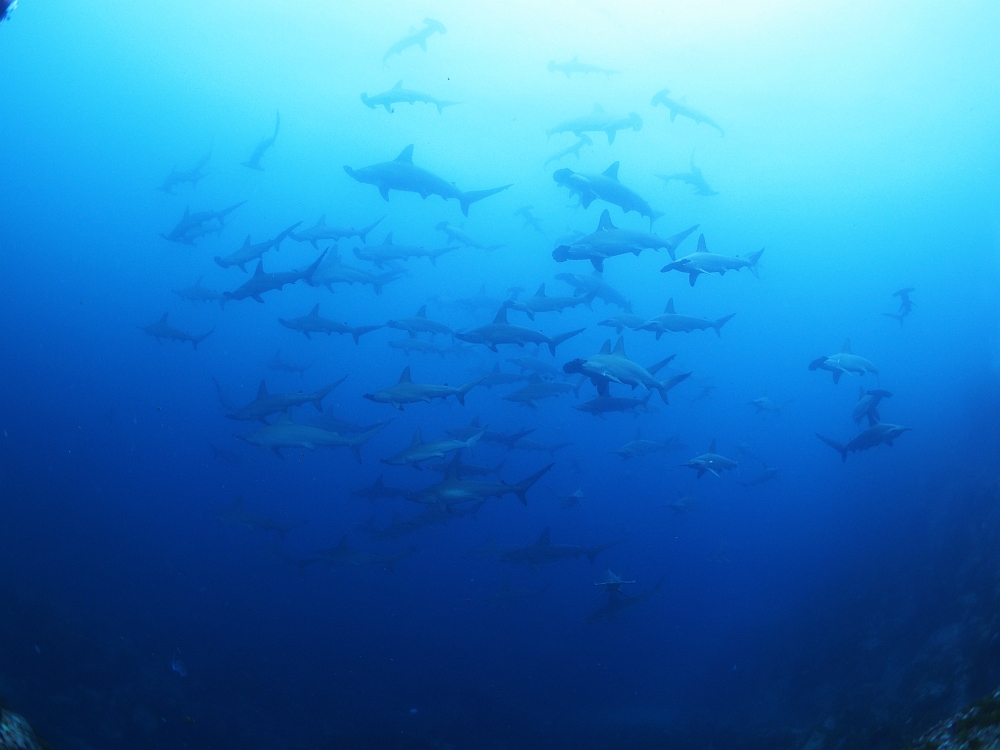 暖かい潮を探してさまよっていると…いました!中層に泳ぐハンマーたち!